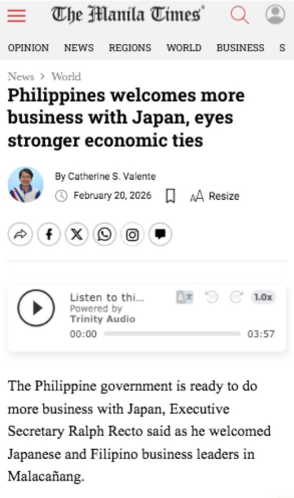 Editor’s View: Executive Secretary Recto’s message to Japanese business leaders was direct: the Philippines is ready and committed to making business easier and faster. Trade hit Php 1.27 trillion in 2025, with Japan the top FDI source at P42.5 billion. Focus areas – semiconductors, automotive including EVs, aerospace, renewable energy – align with where Japanese capital adds most value. President Marcos reinforced the message during a courtesy call. The real substance is execution: if customs streamlines and infrastructure advances, Japanese firms will respond. Japan’s reputation is strong. What’s being offered now is policy consistency to back it up.